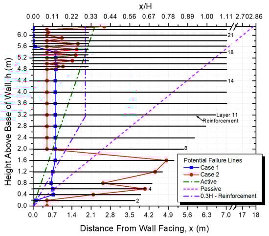 The potential failure surface in a reinforced soil wall is assumed to coincide with the locus of the maximum tensile force in each reinforcement layer []. The locus of the maximum tensile force in each reinforcement layer concurs with the locus of the maximum strain, wherein the potential failure surface may occur. Hence, in this study, Figure 12 shows the locations of the maximum reinforcement strain obtained from the numerical analysis results with height of the wall and the theoretical potential failure surfaces for comparison. It can be observed that the locus of maximum reinforcement strain is generally within the active zone, within the theoretical zone of the maximum stress, or on thr potential failure surface for extensible reinforcements. Moreover, it can be observed that from the 7th reinforcement layer ( m), going down towards the base of the wall, the maximum reinforcement strains are found outside the theoretical active zone for both the GRS-IB and GRS-IBS models. The presence of the foundation soil at the bottom front of the wall facing may have attributed to the deviation of the maximum reinforcement strain location at the lower reinforcement layers due to the lateral pressures that it created.