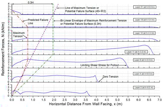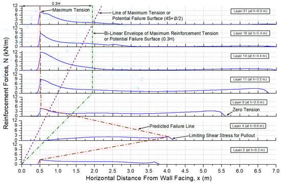 When the failure develops, the geosynthetic (extensible) reinforcement tends to elongate and may be deformed at the point at which it intersects with the failure surface. This results in an increase of tensile force in the reinforcement []. In this study, the distribution of reinforcement forces at seven elevations (seven reinforcement layers) within the GRS abutment are plotted in Figure 13 and Figure 14 for the GRS-IB (Case 1) and GRS-IBS (Case 2) models, respectively. The seven elevations that correspond to the reinforcement layer numbers 2, 4, 8, 11, 14, 18, and 21 are taken into consideration because of its significant behavior as observed from Figure 12. There are several points of comparison between the Case 1 and Case 2 reinforcement behavior as shown in Figure 13 and Figure 14, respectively. The results show that the reinforcements in Case 2 exhibited greater forces than those in Case 1. This can be attributed to the great bridge surcharge loads that is directly supported by the Case 2 GRS abutment at the bearing bed (bridge seat). Hence, it can be observed that upper reinforcement layers exhibited greater forces than those at lower layers. On the contrary, the lower reinforcement layers for Case 1 exhibited greater forces than those at the upper layers. Moreover, the maximum reinforcement forces in Case 1 occurred mostly at 0.80 m from the wall facing, while the maximum reinforcement forces in Case 2 occurred mostly at the connection point of the reinforcement and block facing, which is 0.5 m from the wall facing. It can be inferred that the connection point of the block facing and reinforcement at 0.50 m from the wall facing is critical. The difference in stiffness and unit weight between the block and backfill soil may have attributed to behavior of the reinforcement at the said connection point. Consequently, the differences in settlement between the block facing and backfill soil, which are evident at the top and base of the wall, resulted in an increase of reinforcement forces or strain at the said connection point. Lastly, both models also exhibited great tension near the end of the reinforcements, which indicates the limiting shear stress for pullout.