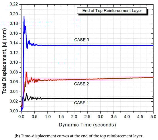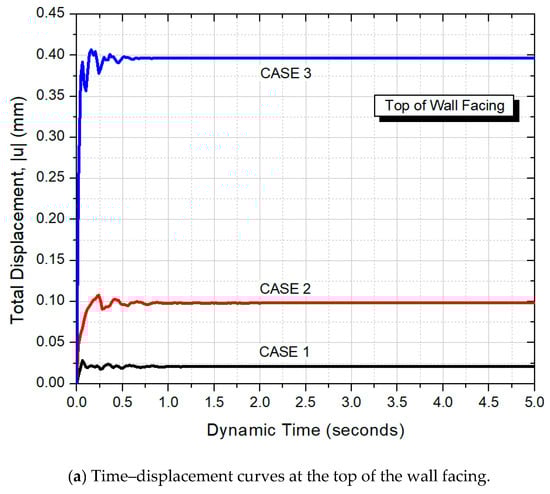 For the seismic response at the top of the wall facing (see Figure 15a), the vibrations are intense between the periods of 0 s to 0.5 s. Moreover, the results show that the Case 1 (GRS-IB) model has the least total displacement in response to the seismic loading, followed by the Case 2 (GRS-IBS) model and Case 3 (IB) model which showed the greatest total displacement in response to the seismic loading. Similarly, the seismic response at the end of the top reinforcement layer (see Figure 15b) showed that, generally, the total displacement curves straighten at the point after 0.75 s of the dynamic time. In this case, the vibrations are more intense between the periods of 0 s to 0.75 s but have a lesser magnitude compared to those at the wall facing. Moreover, the results show that the Case 1 (GRS-IB) model has the least total displacement in response to the seismic loading, followed by the Case 2 (GRS-IBS) model and Case 3 (IB) model which showed the greatest total displacement in response to the seismic loading.