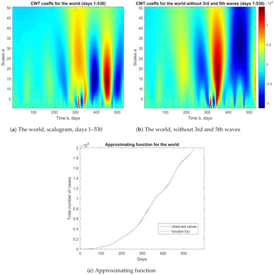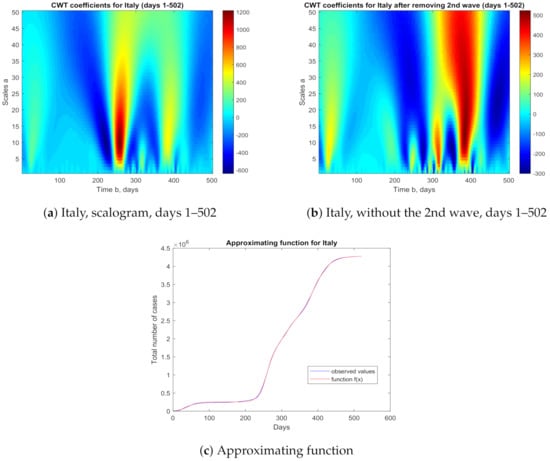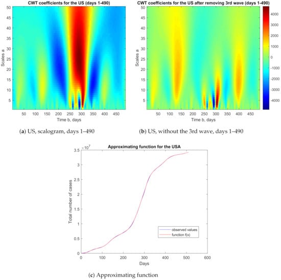 with the error 13,433. Figure 4 shows scalograms with CWT coefficients and the approximating function (25).