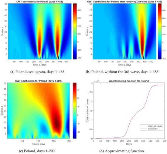 Using the example of Germany, we will show in detail the steps leading to the approximating function (23). We analyze the data over a period of 496 days from 7 March 2020 () to 15 July 2021 (). On the scalogram (Figure 2a) showing CWT coefficients, we can distinguish three large logistic waves. We read for them initially (before optimization) the values of parameters a and b, as well as the value of the CWT coefficient (i.e., the integral (21)). Then, we calculate their estimated saturation levels using Formula (22). We have: