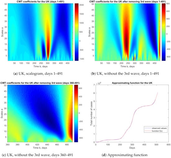 For the UK we analyze the period of 491 days from 12 March 2020 () to 15 July 2021 (). Figure 5 shows scalograms with CWT coefficients.