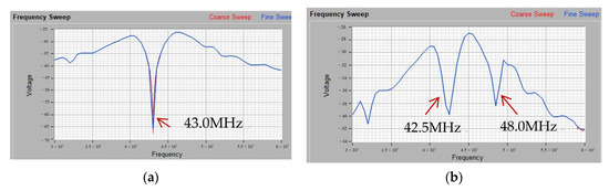 RF scan with two probes on failed sample: (a) F = 42.5 MHz; (b) F = 48.0 MHz.