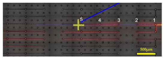 The yellow cross shows the position of the possible open location, as shown in Figure 9 and Figure 10. The linear decay shows us more precisely where the current signal disappears. The linear decay works best with the signals that propagate in one plane. This particular signal seems to changes planes at the same time as it is decaying. We may experience some overshooting from the actual open location. The possible location of the opening was on the right side of the sample in the proximity of the fifth via (see blue arrow in Figure 10). Given the proximity of the location to the via, the fifth via was viewed as the likely opening location.