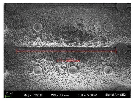 In order to achieve sub-micron resolution, according to the electrical test results, local scanning should be conducted with channel 6 as the center. Due to the long channel, multiple partition scanning is required, followed by image reconstruction and observation, which requires a longer test time. Under the test voltage of 150 kV and the test current of 15 µA, the three-dimensional stereogram, XY section, YZ section and XZ section morphology of the sample in the local magnification scanning are shown in Figure 12. It can be seen that TSV copper columns are arranged neatly and uniformly in thickness, with no voids or cracks. Defects were observed in the Top_M1 layer connecting the two copper pillars. The fracture morphology of the metal layer observed in the XY section is shown in Figure 13. The defect location identified by magnetic field imaging is consistent with three-dimensional X-ray microscopy.
