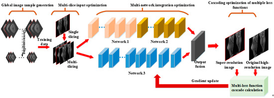 However, the current deep learning technology still has three limitations when applying to MR images’ super-resolution. (1) The characteristics of MR images’ sequence are not fully considered. The imaging method of MR images is different from natural images. In the process of MR images, a series of images with similar structures can be obtained. Therefore, compared with natural images, MR sequence images can provide richer structural information and make the network more robust to noise. (2) At present, most deep networks adopt L1 or L2 loss functions, which are all based on a pixel-by-pixel comparison without considering human visual perception. At the same time, they are easy to fall into the local optimal solution, and it is difficult to obtain the optimal effect [20]. (3) The capability of feature representation of deep learning networks gradually increases with the deepening of the network. However, with the huge network structure, the training difficulty of the network also increases exponentially, which makes it difficult to achieve a good balance between model complexity and training difficulty.