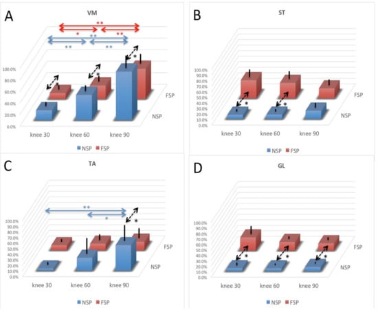 Muscle activity compared at different knee flexion angles in the FSP and NSP. Muscle activity is compared at different knee flexion angles of 30°, 60°, and 90° in the FSP and NSP. The measured muscles are vastus medialis (VM, (A)), semitendinosus (ST, (B)), tibialis anterior (TA, (C)), and gastrocnemius muscle lateral head (GL, (D)). Muscle activity is normalized using the integrated EMG at maximum voluntary isometric contraction. Black arrows show the differences between the FSP and NSP, which were previously reported. * Significant difference (p < 0.05) for multiple comparisons. ** Significant difference (p < 0.01).