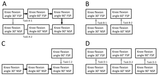 Figure 1 shows the muscle activity at the three knee flexion angles in the FSP and NSP. In one-way repeated measures analysis of variance by ranks, the knee flexion angle induced significant changes in VM muscle activity in the NSP and FSP (Figure 1A) and TA muscle activity in the NSP (Figure 1C). No significant differences were found in the ST muscle activity (Figure 1B) and GL muscle activity (Figure 1C). The black arrows illustrate the differences between the NSP and FSP (Figure 1A–D), as reported in a previous study []. In the multiple comparison analyses, significant differences were found in VM muscle activity at 30° vs. 60° (p < 0.05, in the FSP and p < 0.01, in the NSP), at 30° vs. 90° (p < 0.01 in the FSP and the NSP), and 60° vs. 90° in the FSP and the NSP (p < 0.01 in the FSP and the NSP). Furthermore, significant differences were found in TA muscle activity at 30° vs. 90° in the NSP (p < 0.01) and 60° vs. 90° in the NSP (p < 0.05) (Figure 1C).