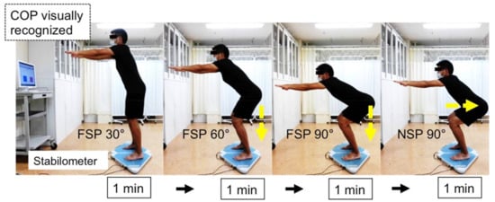 In the experiments, the participants could confirm the COP shifting by themselves, and assistance was needed to maintain the knee flexion angles. It would be ideal for active posture control if the participants could also visually ensure knee flexion angles using some devices. This pilot study has some limitations, including the sample size, sex, and training background of the participants. Further investigation of the appropriate training intensity should be considered as it is essential to modulate it by the number of training tasks for individual conditions. Stepwise loading may relieve the impact for elderly people, especially those at risk of frailty.