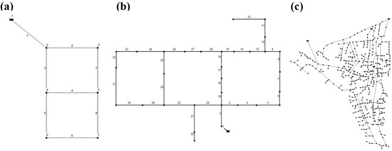 As mentioned in the previous section, the three WDSs selected for the application of our model are shown in Figure 1.