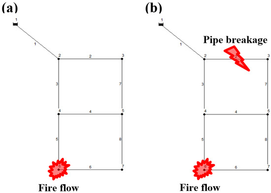 To apply Scenario 1 (fire flow condition) in WDSs, node 6 is selected to increase the demand, and Scenario 2 is simulated by a fire flow pipe breakage condition simultaneously with pipe 2 and node 6, as shown in Figure 3. The results for Scenario 1 for the two-loop network are presented in Table 2.