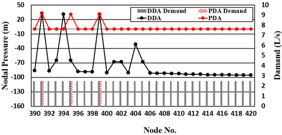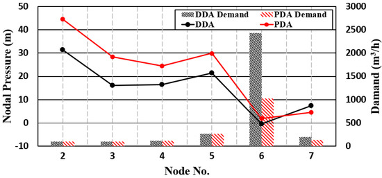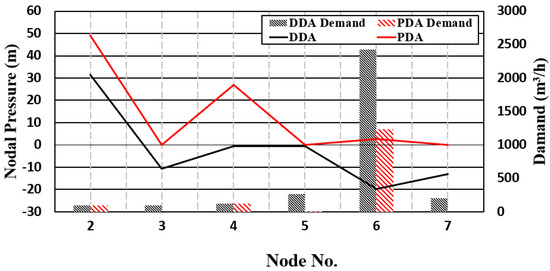 A similar analysis was performed for Scenario 2, where pipe 2 and node 6 were both selected to simulate an abnormal condition. Table 3 shows the results of DDA and PDA analyses. The difference between the two approaches is noticeable because the negative pressures are replaced with zero values in PDA due to the insufficient nodal pressure. Finally, Figure 5 presents a comparison of nodal pressure results from Scenario 2. The incidence of pipe break can be easily identified because of the high number of nodes with negative pressure.