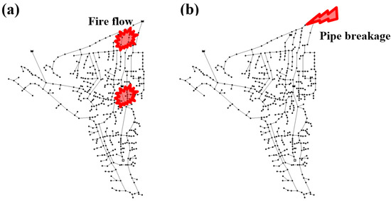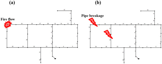 Abnormal system conditions for Hanoi network: (a) Scenario 1 and (b) Scenario 2.