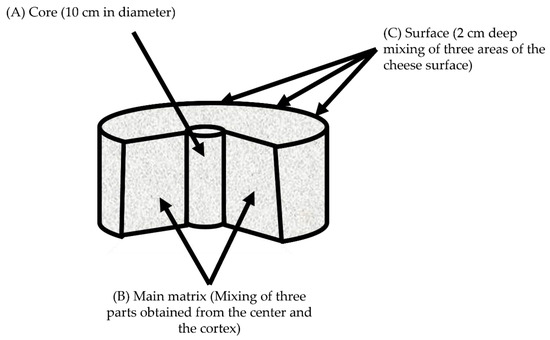 Each 20-kg cheese was made using 180 L of unpasteurized milk. Cheeses were made immediately after the milk was obtained, and the main matrix was salted within the first 9 h. Sixteen cheeses were made for this work. Eight were left uninoculated (negative controls). Eight were inoculated with 6 log CFU/mL of S. aureus ATCC 13565, S. Typhimurium ATCC 14028, L. monocytogenes ATCC BAA-751, respectively, and staphylococcal toxin. The analysis of the cheese already molded and in the process of maturing began at 24 h. It is worth mentioning that at each sampling time, a complete cheese was taken. For sampling, each cheese was divided into three uniform vertical: (A) Core, (B) Main matrix, and (C) Surface (Figure 1).