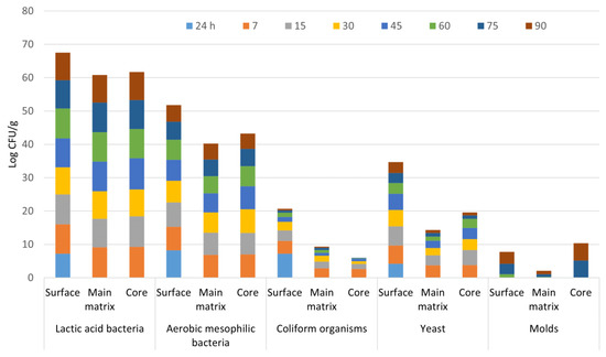 The indicator groups in cheese showed that after seven days of maturation, LAB continued to show a homogeneous behavior in the microbial content of the different areas analyzed (core, main matrix, and surface) and between the non-inoculated and inoculated cheese. In non-inoculated cheese, indicator groups maintained an average of around 9.0 log of CFU/g until day 45, then decreased to 1 log CFU/g from day 60, maintaining those count values until the end of this work. In the inoculated Cotija cheese, the LAB behavior was similar. However, it was maintained with an 8.8 log CFU/g until the end of the study.