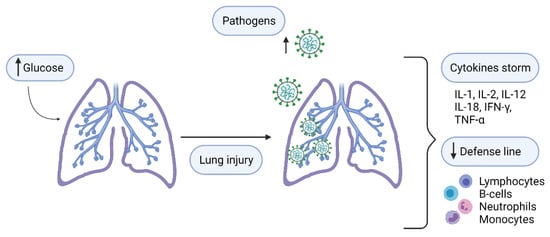 Hyperglycemia in the lungs. The increase of glucose in the lungs causes lesions and the inflammatory state, which in turn provokes the line of defense in the lungs for diminishing and giving rise to an increase of pathogens, in addition to pulmonary damage. Created with BioRender.com (accessed on 1 September 2021).