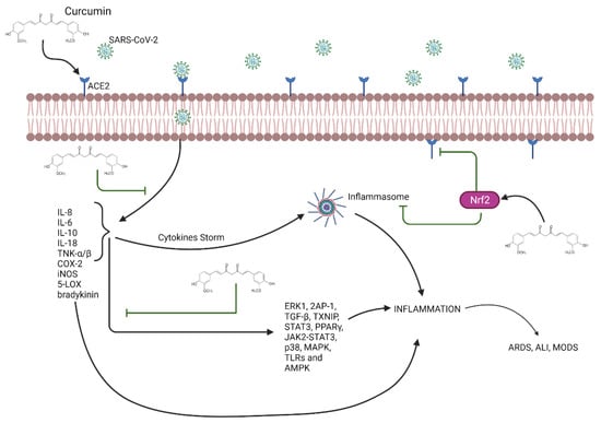 The mechanism of action of curcumin. Curcumin can act through the possible interaction that it entertains with the S protein of the virus, blocking the entry of the virus into the cell. Curcumin inhibits exposure to proinflammatory cyto-kines, such as inflammatory enzymes. In addition to blocking transduction pathways, it blocks activation of the in-flammasome and inhibits the expression of ACE2 through the activation of Nrf2 caused by curcumin. Therefore, cur-cumin inhibits inflammation and avoids the development of the acute respiratory distress syndrome (ARDS), Acute Lung Injury (ALI), and the Multiple Organ Dysfunction Syndromes (MOD) of lungs, liver, kidneys, and brain. Created with BioRender.com (accessed on 1 September 2021).