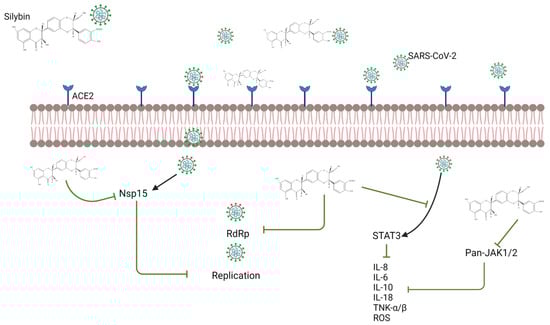 The silybin component of silymarin has a possible direct effect on the STAT3 regulator of the inflammatory cytokine pathway and on the immune response. It could be phenotypically related to the mechanisms of action of the monoclonal antibodies of IL-6 and pan-JAK1/2 inhibitors, with the purpose of inhibiting the production of cytokines and lymphopenia in T cells, both of which are recurrent in severe cases of COVID-19. In addition, it could be the most propitious inhibitor against SARS-CoV-2, due to its coupling with the target genes of the virus, inhibiting RNA-dependent RNA polymerase-mediated RNA (RdRp), which is indispensable in the replication/transcription of SARS-CoV-2 and above the peak of the ACE2 glycoprotein [,] (Figure 3).