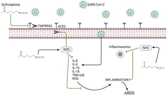 It has been observed that, in patients with infection by COVID-19, their condition often becomes critical; therefore, the proinflammatory system (C-reactive protein, the cytokines IL-6 and IL-8, and TNF-α, etc.) is activated. There is an increase of ROS that gives rise to cellular and tissue damage. The acute respiratory distress syndrome (ARDS) develops and there is an alteration in vascular permeability (endothelial dysfunction and thrombosis). It has been suggested that the activation of Nfr2 could improve the state caused by SARS-CoV-2; to date it has suppressed the expression of cytokines and activation of the inflammasome; in addition, it protects the respiratory epithelium and the vascular endothelium and enhances the expression of antioxidant enzymes []. It has been reported that sulforaphane tends to be an activator of Nrf2. On the other hand, sulforaphane has been proposed as a strategic treatment against COVID-19, because this compound possesses the function of activating Nrf2, which provides cytoprotection due to the homeostasis of proteins and redox, in addition to it inhibiting inflammation []. According to Benarba et al. [], natural products such as sulforaphane maintain a beneficial effect on confronting SARS-CoV-2 in terms of blocking the ACE2 receptor or the serine protease TMPRRS2, which are indispensable for human cellular infection (Figure 4).