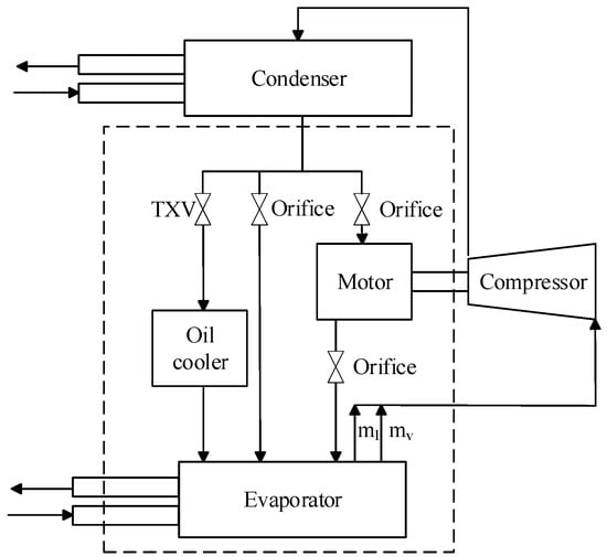 where mv, ml are the vapor and liquid flow rate from the evaporator, respectively; ml is the amount of liquid entrainment; Qe, Qmotor and Qoil are the cooling capacity of evaporator, the heat dissipation rate of motor and the heat dissipation rate of oil cooler, respectively; h0,evo and h0,elo are the total enthalpy of the refrigerant vapor and liquid at the outlet of the evaporator (i.e., the inlet of the compressor), respectively; hsub is the enthalpy of liquid refrigerant at the outlet of the condenser.