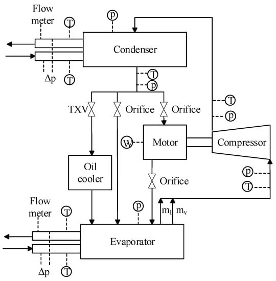 All instruments were calibrated before the experiment. Table 1 lists the instrument and uncertainty of the measured parameters. Since a water mixer was installed before the inlet and outlet temperature measurement points of the evaporator and condenser, respectively, it can be considered that the inlet and outlet water temperatures of the evaporator and condenser are uniform and the measurement uncertainty of the water temperature depends on the sensor accuracy. Considering the possible non-uniform distribution of suction and discharge temperatures on the cross-section of measuring points, the uncertainty of both suction and discharge temperatures is assumed to be ±0.1 °C (the influence of measurement uncertainty will be analyzed below). All parameters are collected by an Agilent data logger. Then, the data are read, processed and stored using a program running in Labpro.