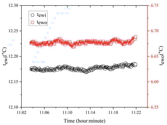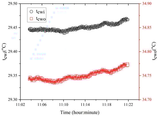 Figure 4 and Figure 5 show the raw data of inlet and outlet water temperature of evaporator and condenser under the condition of 700 RT and 581 kg charge (the full charge for the evaporator), respectively. It can be seen from the figures that when the working condition reaches a stable state, the inlet and outlet water temperatures of evaporator and condenser change very slightly, less than 0.05 °C. Similar results were obtained for other conditions.