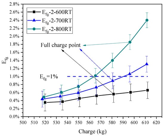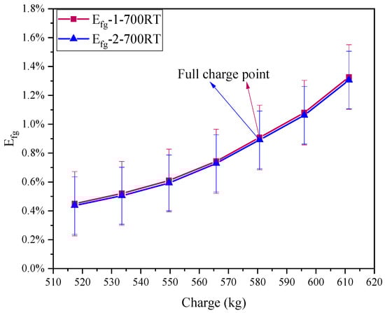 Table 2 shows the entrainment factor Efg and its uncertainty under 700 RT and 581 kg of charge, including the results using Equation (14) (Method 1) and Equation (15) (Method 2). The table also shows the impact on the Efg results if the uncertainty of the transmission power loss is doubled. As shown in the table, the calculated Efg value of Equation (15) is about 2% lower than that of Equation (14). The difference is related to the system thermal balance, the better the system thermal balance, the smaller the difference between the two methods will be. Since the thermal balance of this experimental point is −0.23% (the thermal balance of all test points is within −0.80%~−0.18%), the difference between the two methods is small. The thermal balance of the system can partly reflect the reliability of the measurement results, so it is recommended that the thermal balance of the experimental points be within 1%. As shown in the table, the relative uncertainties of Efg for methods one and two are 24% and 22%, respectively. Since the results from the two methods are very close to each other for a system with good thermal balance and the accuracy of Method 2 is higher, it is recommended to use Method 2 (Equation (15)) to calculate Efg. As can be seen from the table, if the uncertainty of the transmission power loss is doubled, the relative uncertainty of the Efg of methods one and two will increase to 29% and 27%, respectively. Therefore, the transmission power loss has a great impact on the uncertainty of Efg. The accuracy of the transmission power loss can be improved by directly measuring the heat exchange rate of the oil cooler.