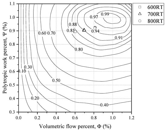 where pc, pe are condensation and evaporation pressure respectively, vc is the specific volume of refrigerant vapor at condenser state, determined by the condensation pressure and discharge enthalpy; f correction factor is introduced to correct the error of calculating the polytropic compression work by using the approximate polytropic process equation [22]. f is about 1.005 for all test points. wn is the rated specific polytropic work, wn =21.4 kJ·kg−1. Once Φ and Ψ are known, the efficiency factor η of the compressor is obtained from the compressor map, then the polytopic efficiency ηc is calculated by Equation (27).