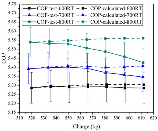 Figure 11 shows the variation of test and calculated COP with refrigerant charge at each cooling capacity. The calculated COP values of each curve in Figure 11 were corrected by a constant (0.06, −0.03, −0.05 for 600, 700, 800 RT, respectively) so that the calculated COP at the first point of each curve coincides with the experimental value, to eliminate the influence of the calculation model error and clearly reflect the trend of the influence of the liquid entrainment on COP. As can be seen from Figure 11, the variation of the calculated COP is small (less than 0.5%) for each curve, mainly because the temperature LIFT is almost constant for each curve (0–0.18 °C, see Figure 9) and the variations of the cooling capacity are also small for each curve (1.1–1.4%).