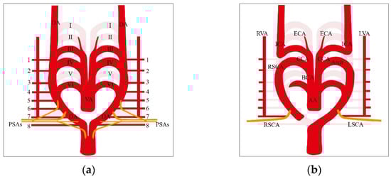 At the early stage of embryological development of the arterial system, six aortic arches arise from the truncus arteriosus on each side and connect to the paired dorsal aorta. These aortic arches selectively regress to form the adult-type aortic arch and its major branches. Among the arches, the paired 3rd arches form the common carotid artery, the origin of the internal carotid artery, and the cranial part of the dorsal aorta beyond the 3rd arch become the primitive internal carotid artery. The 4th left arch forms the distal main part of the adult aortic arch. The dorsal aorta gives off the paired segmental arteries from the cervical to the sacral region to supply the developing somites and spinal cord [4]. At the 7-mm stage (day 32), seven cervical segmental arteries (CSAs) appear, originating from each of the paired dorsal aortas accompanying segmental cervical nerves 2–8. According to a study by Aizawa et al. on the development of the subclavian artery in the rat embryo, a few arterial trunks of the forelimbs (primary subclavian artery) arise from the lateral surface of the dorsal aorta at the 6th–10th segmental levels to form a vascular network (Figure 1a) [5]. The primary subclavian arteries anastomose with neighboring segmental arteries, and then the origins of those segmental arteries regress. One of the primary subclavian arteries at the level of the 7th segment becomes thicker, and the others regress. Then, the anastomosis between the primary subclavian artery and the 7th CSA forms the proximal part of the future vertebral artery. The paired dorsal aorta begins to fuse at the midline to form a single dorsal aorta. The level of fusion of the dorsal aorta transitionally reaches the most cranial point near the third CSA level but shifts down to the origin of the level of the 7th CSA. The caudal part of the right dorsal aorta (just before its confluence with the left dorsal aorta) regresses, and the right subclavian artery (RSCA) is formed by the remnant part of the right dorsal aorta and the primary subclavian artery. The left subclavian artery is formed by the left primary subclavian artery at the 7th CSA level. At the 7-mm stage, the primitive VA appears, and its development is usually complete by the 14- to 17-mm stage [4,5,6]. At the 10- to 12-mm stage, the postcostal longitudinal anastomosis develops between the CSAs (developing bilaterally from the 1st to the 7th CSAs) and becomes the VA [7]. At the 14- to 17-mm stage, the aortic origins of the first 6 CSAs regress, and the 7th CSA becomes the branches of the SCA. This developmental process results in a normal pattern of development of the VA from the SCA (Figure 1b). As a result of normal development of the arterial system, the right vertebral artery (RVA) usually arises from the right subclavian artery (RSCA) as its first branch at the upper part, just proximal to the origin of the thyrocervical trunk. The RVA enters the transverse foramen of the 6th cervical spine and runs upward into the posterior fossa through the foramen magnum. The RVA gives off segmental arteries that supply the corresponding vertebrae, cervical nerve, dura mater, and paravertebral muscles. Some of them give off the anterior and/or posterior radiculomedullary artery supplying the spinal cord.