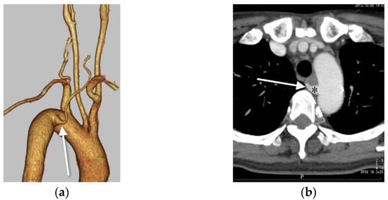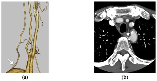 There are some points where the RVA can arise directly from the aorta [1,2,3]. The most common site of the aortic origin of the RVA is the distal portion of the aortic arch beyond the origin of the LSCA, which accounts for 85.7% of aortic-origin RVAs (Figure 3a,b). Other sites of aortic origin of the RVA are rare and include the site between the left common carotid artery (LCCA) and LSCA, at the ascending aorta, and between the RSCA and the right common carotid artery (RCCA) with a missing brachiocephalic artery [1,2,8,9,10]. Lemke et al. presumed that the embryotic mechanism of an aortic origin of the RVA was from the distal portion to the LSCA. According to their hypothesis, it is caused by the RVA originating from the persistent right 8th CSA [8] and the physiologic obliteration of the right dorsal aorta distal from the 7th CSA (Figure 2a). This type of aortic origin of the RVA is occasionally associated with the diverticulum of Kommerell, which is thought to be a remnant of the distal part of the right dorsal aorta [11] (Figure 4a,b). The embryologic mechanisms of the other types of aortic origin of the right VA may be more complicated processes involving fusion and division of the dorsal aorta, regression of the primary subclavian arteries and cervical segmental arteries and their anastomoses.