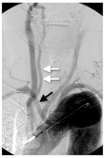 Right VA originating from the common carotid artery with RSCA. Anteroposterior view on aortography shows the RVA arising from the right common carotid artery (double white arrow). An aberrant RSCA is also detected (black arrow).