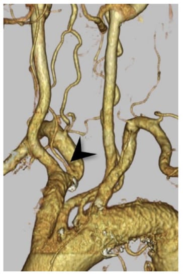- Vitošević, F.; Vitošević, Z.; Rasulić, L. The right vertebral artery arising from the right common carotid artery: Report of a rare case. Case Reports. Surg. Radiol. Anat. 2020, 42, 1263–1266. [Google Scholar] [CrossRef] [PubMed]