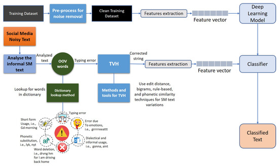 In text analysis applications based on machine/deep-learning techniques the ideal case is to have clean data for accurate classification. However, the social network data contains a vast range of variations which distort the performance of the text classification. It is inevitable to either clean/normalize the SM text or embed the intentionally generated OOV words in the lexicon for accurate classification. Both approaches have limitations: the former approach is time- and resource-consuming due to huge volume of training data required for model training whereas the latter method falls short in coverage of different intentionally generated variations due to users’ different behaviors of text generation. In this work, we adopted the approach to train the text analysis model with clean SM text and normalize the input SM text before feeding it to the classifier as shown in Figure 1.