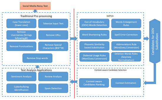 The variations in SM informal text result in out-of-vocabulary (OOV) words, which are considered noise, and may result in inaccurate text classification [9,10]. Accuracy is critical in most text analysis applications such as review classification and ranking, cyberbully identification and control, spam detection, opinion mining, and SM analytics. For accurate analysis, the SM text needs to be tamed before applying it to the text analysis models. Most of the traditional text analysis models fail to sense such noisy words present in the text because of their lexical invalidity, which results in the loss of sentiment information. Another commonly used method to handle textual noise is to extend the lexicon by manually/automatically adding the most frequent OOV words to the list of valid words. This method is time- and resource-consuming and is highly application- and data-dependent. Text normalization is a pre-processing step before applying the text to the text analysis applications to resolve information loss and resource consumption issues.