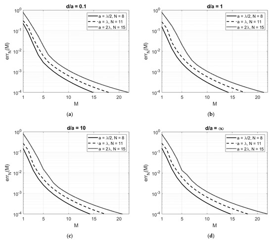 Relative computation error for a two stacked thin resistive disks resonator with different values of the radius of the disks () and of the distance between the disks (). , , , , , and TE incidence: (a) ; (b) ; (c) ; (d) .