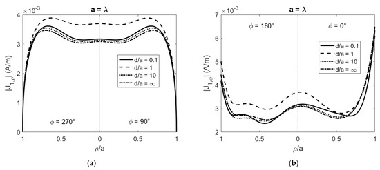 In Figure 2, is plotted for different values of the radius () and the distance between the disks (). As can be clearly seen, the error is substantially independent of the distance between the disks and it depends slightly on the radius of the disks in all the examined cases. It is apparent as the convergence is really very fast. Indeed, in the worst case examined ( and ), a relative error less than 1% is obtained for and with a computation time (t) of only 9 s. Moreover, more accurate solutions can be quickly obtained. Indeed, a relative error less than 0.1% and 0.01% is obtained for at most , and , , respectively. In the examples examined in the following M will be chosen in order to guarantee a relative error less than 1%. In Figure 3, for the sake of completeness, the reconstructed behavior of the components of the effective surface current densities for and for different values of the radius () is shown. Moreover, in Figure 4, the behavior of the components of the current on the disk 1, plotted for and for different values of the distance between the disks (), clearly shows that the proposed method tends to reconstruct the solution obtained in the case of a single disk () as the distance between the disks increases.