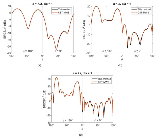 In Figure 5, BRCS is plotted for the cases considered in Figure 3, i.e., for and for . Comparisons with CST-MWS are provided for all the examined cases. As can be clearly seen, the agreement is really very good. However, the proposed method drastically outperforms the Integral Equation solver of CST-MWS, which requires tens of thousands of cells and a few minutes to find a reasonable approximation of the solution.