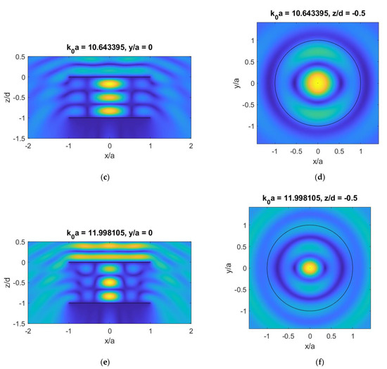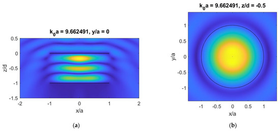 In order to clearly appreciate the resonant behavior of the proposed structure, it is assumed , i.e., the losses are reduced with respect to the cases examined above, providing the conditions for sufficiently high Q-factors of the resonant modes. Moreover, orthogonal incidence, i.e., , is considered so that only the harmonics for contribute to the representation of the solution. In Figure 6, TSCS and ACS for are plotted for varying values of the normalized frequency, . An almost periodic sequence of peaks can be clearly identified. In Figure 7 and Figure 8, the near E-field in the xz plane and plane is shown at the resonant frequencies in the two periods marked by the rectangular windows in Figure 6. It is interesting to observe that the field behavior is reconstructed by using at most 10 expansion functions for each unknown. Moreover, a given number of oscillations along the z axis is associated with each period, whereas the resonances in a period differ from each other by the number of oscillations along the radial direction. As expected, the resonances associated with the most pronounced peaks show a better confinement of the field between the disks.