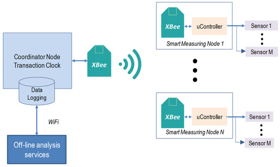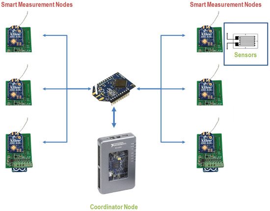 The details of the acquisition system were discussed, including: the topology and configuration of the selected communication technology, XBee at 900 MHz; the nodes involved, the so-called Coordinator Node and Smart Measuring Nodes; and the design of the logical protocol and frames. The proposed system was implemented over a real-time embedded platform commonly accepted in industrial applications, such as the Compact RIO series, provided by National Instruments. In addition, a module, the so-called Smart Measuring Node, was specifically designed for easing the connection of the sensors. This module also provides the communication as well as edge processing capabilities.