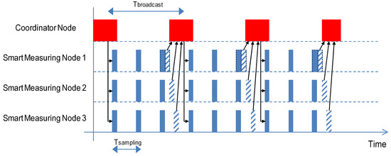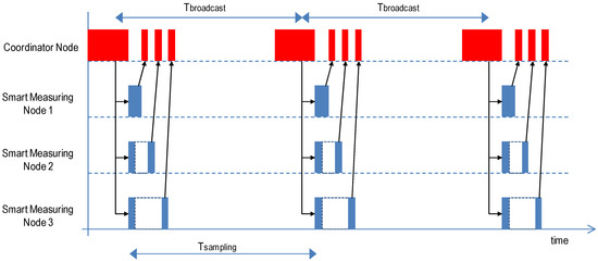 In Figure 6, three Smart Measuring Nodes were configured to take measures synchronously. The broadcast measuring command is issued periodically at Tbroadcast intervals, and every node takes three measures of the attached sensors at Tsampling intervals. The correct use of the offsets allows one to increment the sampling period at the Smart Measuring Nodes. Figure 6 shows the broadcast measuring command and distributed collected values messages.