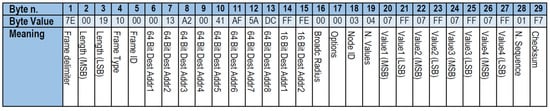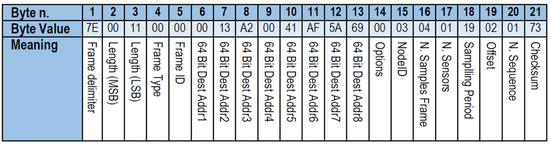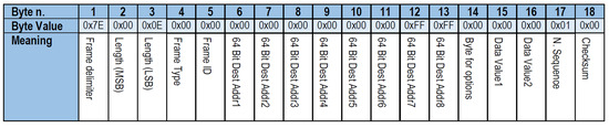XBee modules can be programmed in two operation modes, AT and API, but only the second mode is flexible enough to implement the proposed protocol aimed at monitoring applications. API mode allows for a deeper manipulation of the frames. However, it requires programming at a deeper level so that programs access the information of the frames. Basically, the API operation mode defines four blocks: (1) start delimiter, 0x7E; (2) length of the frame, 2 bytes; (3) API-specific structure, which is the core of the designed protocol and contains several bytes according to the functionality of the protocol, 14 bytes in Figure 2 (from byte 4 to byte 17); and (4) checksum, which is used for error control purpose, 1 byte. Designed frames are serialized to the XBee modules, which are responsible for the transmission.