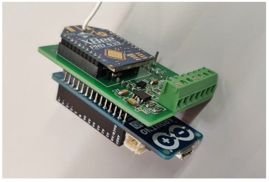 A prototype board for the Smart Measuring Node was designed based on commercial off-the-shelf components in order to simplify the construction of the board (see Figure 8). An Arduino MKR Zero board, based on a 32-bit SAMD microcontroller, was selected for processing purposes. The Arduino MKR Zero may be easily programmed by means of the open-source ArduinoIDE, which makes it easy to write code and upload it. Among other peripherals, it features seven channels of twelve bits analog to digital converters and supports a Li-Po single cell, 3.7 V battery along with an expansion connector compatible with the small form-factor Arduino pinout. Wireless communications are implemented by means of XBee Pro S3B modules, which communicates with the Arduino MKR board by means of an asynchronous (UART) port. An original printed circuit board (PCB) was specifically designed and manufactured to assemble both components. It also features a low-power input to the microcontroller along with a reference voltage, to increase the voltage resolution of the ADC, and four analogue inputs fitted with simple RC low pass filters. This board eases the connectivity of the analogue sensors, which should be in the range of 0–3.3 V, while keeping the expansion port of the Arduino board free to connect other boards as long as they do not interfere with the signals used in this project.