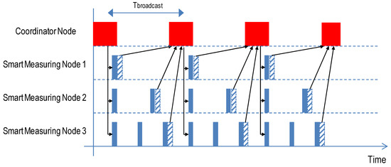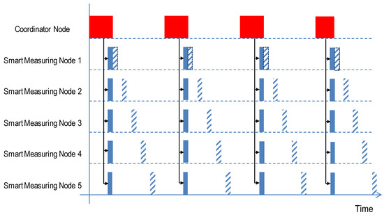 The second scenario, see Figure 10, involves using multiple sampling, as in Figure 6. However, in this scenario, different sampling periods were selected. Namely, a sampling frequency of 10 Hz was chosen for Smart Measuring Node 1, 20 Hz for Smart Measuring Node 2 and 30 Hz for Smart Measuring Node 3, yielding sampling periods of 100, 50 and 33.3, ms respectively. Let us assume that the numbers of attached sensors to SMN1, SMN2 and SMN3 are 4, 2 and 1, respectively. Consequently, the size of the frames would be of 29 bytes for SMN1, 29 bytes for SMN2 and 27 bytes for SMN3.