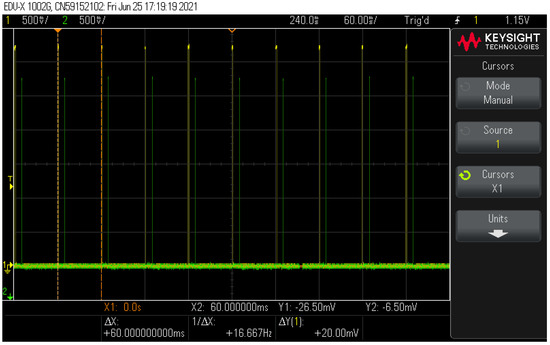 In this scenario, the maximum latency for the sending messages is again below 12 ms. According to the values shown below, a slot value of 15 ms seems adequate for sending the frames with the collected values. Thus, the system could be achieved by periodically sending one broadcast measuring command every 100 ms and configuring the sampling interval to 50 and 33.3 ms, respectively, at each node. The messages that are not received at the defined time slot are discarded, and the message is lost. Thus, according to the experimental values acquired in Section 4, the schedule is feasible.