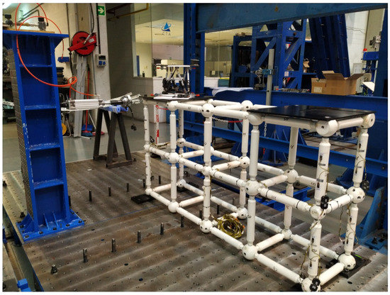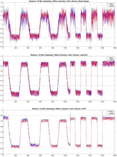 For validation purposes, three different types of sensors attached to the structure were considered. Namely, a strain gauge, a LVDT sensor and a load cell were used to monitor the mechanical strain in a critical bar and the displacement and force values in the knot where the external disturbance is applied. Figure 14 shows the voltage output signals for each sensor. The measurement values obtained with the Smart Measuring Node are shown in blue, while the values obtained by wired links are shown in red. Values were acquired at a distance of 12.30 m from the structure.