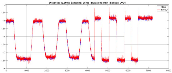 Figure 15 compares the values obtained in a different test performed at a frequency of 40 Hz. In this test, only the LVDT sensor was used. Wireless captured values are shown in blue and wired values in red. In this case, the multiple sampling feature was configured. The monitoring system was configured to sample four times every 100 ms, producing an effective sampling time of 25 ms.