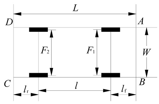 In Figure 3, L is the body length, W is the body width, l is the vehicle wheelbase, lf and lr are the front and rear overhang respectively, F1 and F2 are the front track and rear track respectively, and A, B, C, and D are the left front vertex, right front vertex, right rear vertex, and left rear vertex of the vehicle respectively.