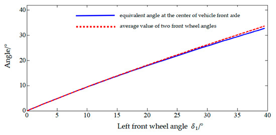 Through Equation (3), the relationship between the angle of the two front wheels and the equivalent angle at the center of vehicle front axle can be obtained, but there is no intuitive reflection. In order to obtain a clearer relationship, Equations (2) and (3) are used to compare the equivalent angle at the center of vehicle front axle with average value of two front wheel angles by MATLAB. As shown in Figure 5, the gap between the equivalent angle at the center of vehicle front axle and average value of two front wheel angles is very small. Therefore, the following approximation is made: