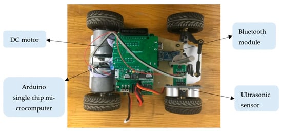 In order to verify the feasibility of parking space detection method by ultrasonic, an intelligent minicar driven by the rear wheels and controlled by Arduino single chip microcomputer is used as the experimental equipment, as shown in Figure 8. The driving motor is a DC motor of model MG5130P30 with Hall encoder, which can realize the speed measurement function. The rated voltage of the motor is 12 V and the rated power is 7 W. The car is equipped with a Bluetooth module BT04, which can wirelessly return the detected distance data through serial port monitor of Arduino.
